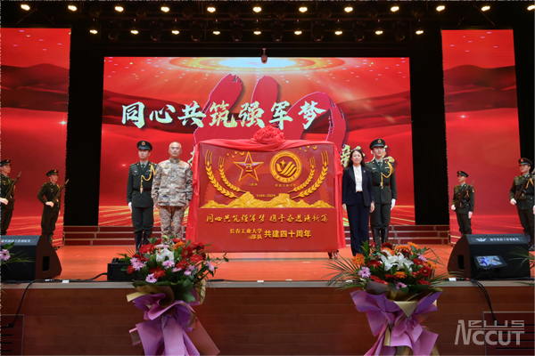学校党委副书记李东玲和共建部队首长共同为学校赠送共建部队的文创雕塑品揭幕,共建部队首长向学校赠送锦旗。
